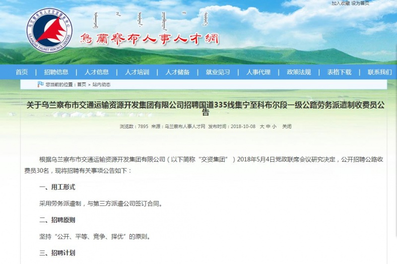 近日,為確保國(guó)道335線集寧至科布爾段一級(jí)公路收費(fèi)工作的順利開展,經(jīng)交資集團(tuán)支委會(huì)會(huì)議研究決定,公開招聘公路收費(fèi)員。